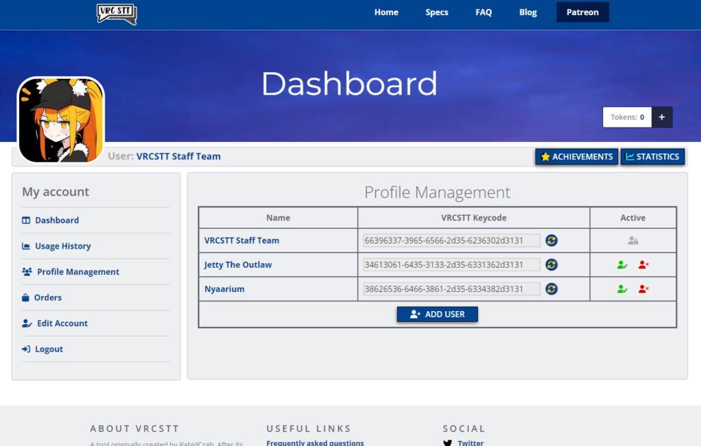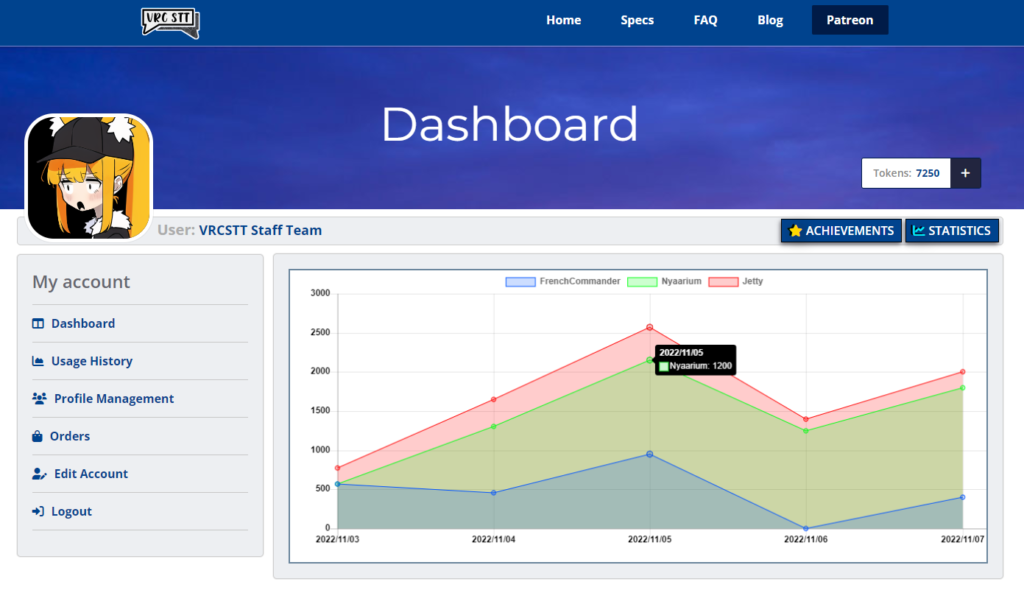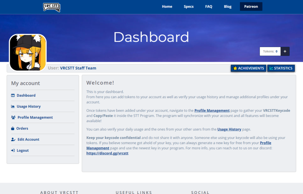 With this new addition to the website, you will now be able to create an account and keep track of tokens you can use for the VRCSTT program and also keep track on a lot of cool things we are planning for the future. It is still under development as I speak, although a good chunk is near completion and working. Your account will be synchronized with the new STT application you are using and you will also be able to verify the usage history you’ve used the previous days. To make it a bit more fun for users, I’ve also started implementing a “Statistics” and “Achievements” overlay that people will be able to check on their account whenever they want (Small note: These 2 features will come out a bit after the dashboard is out).